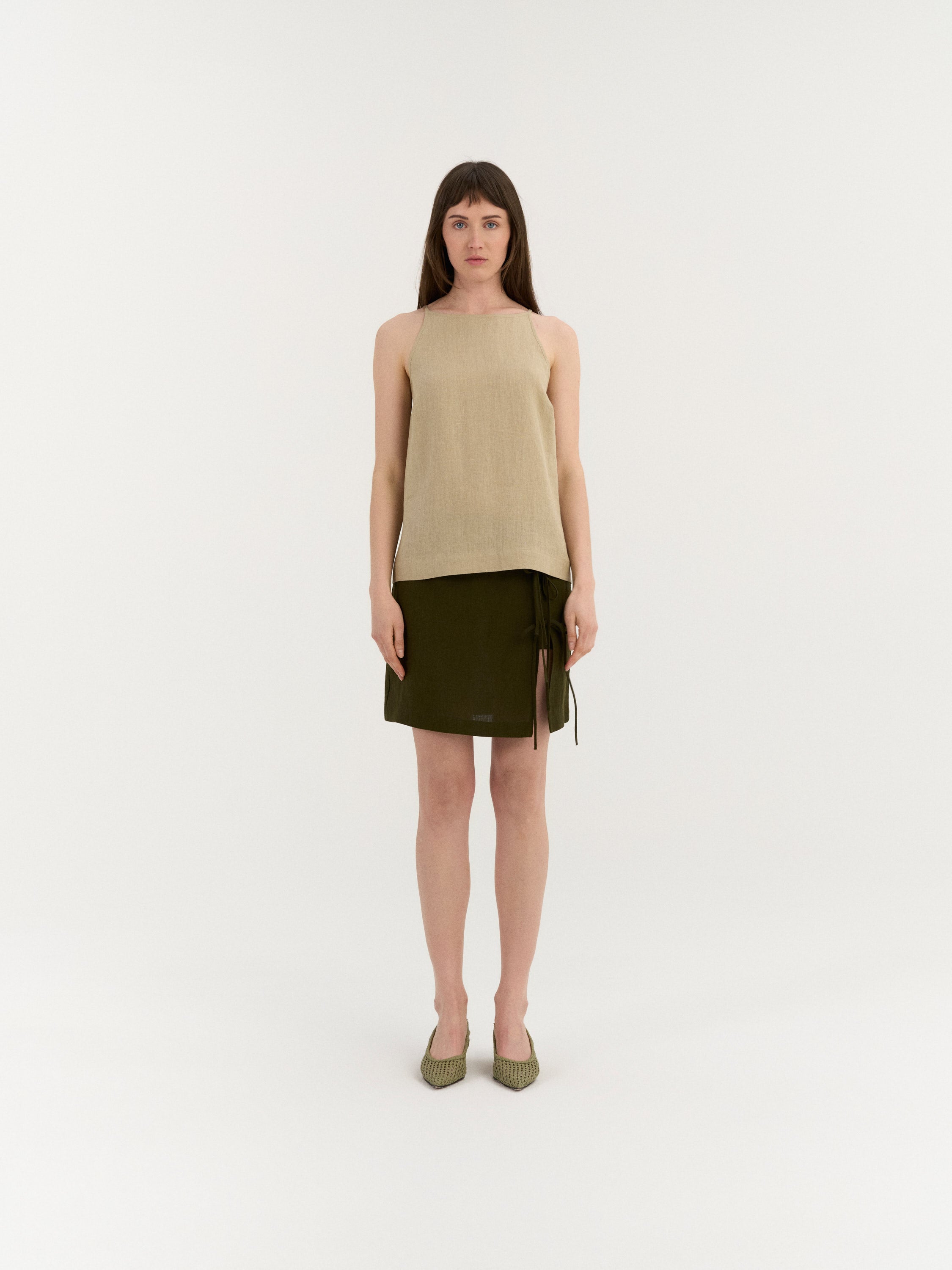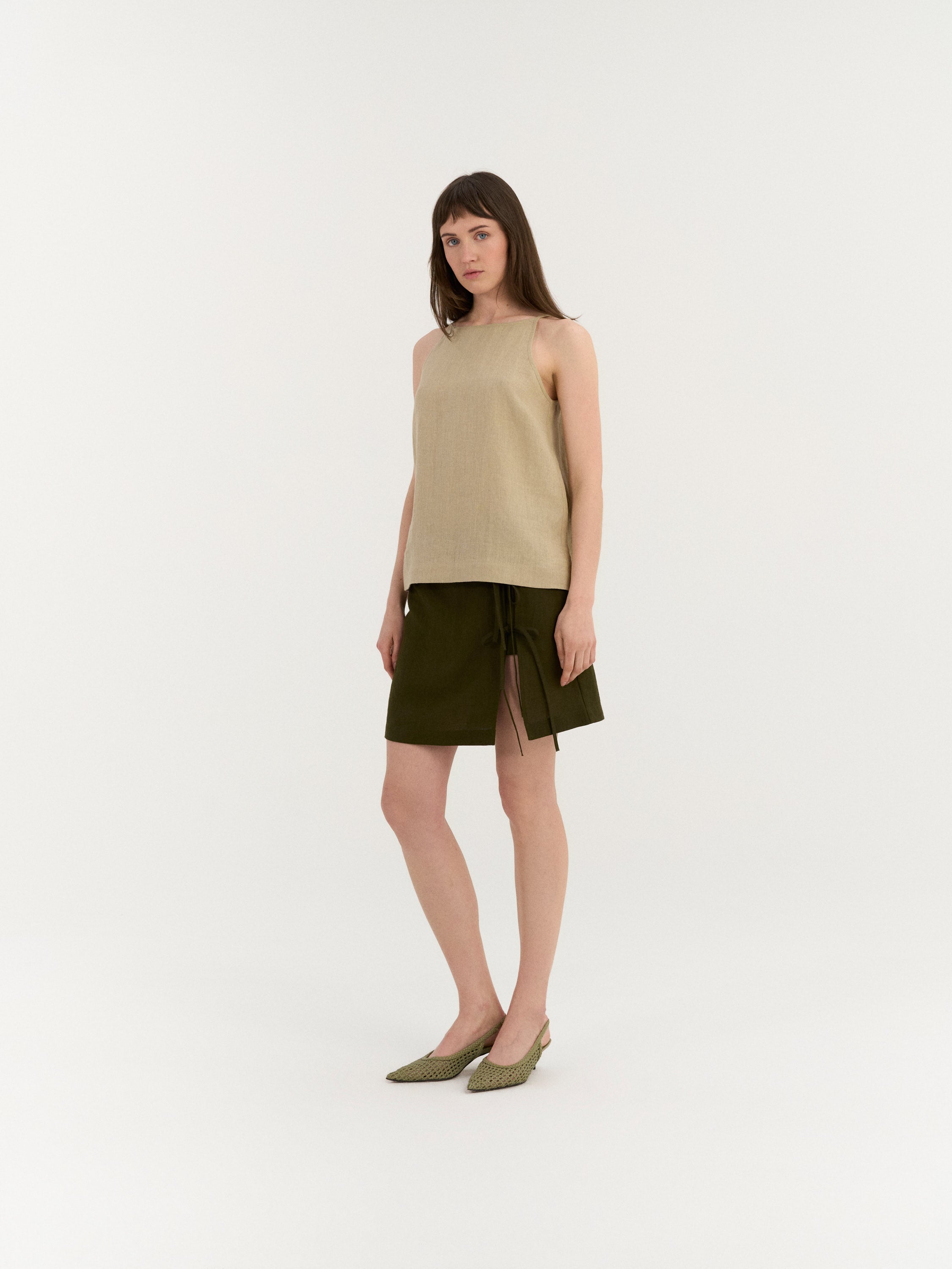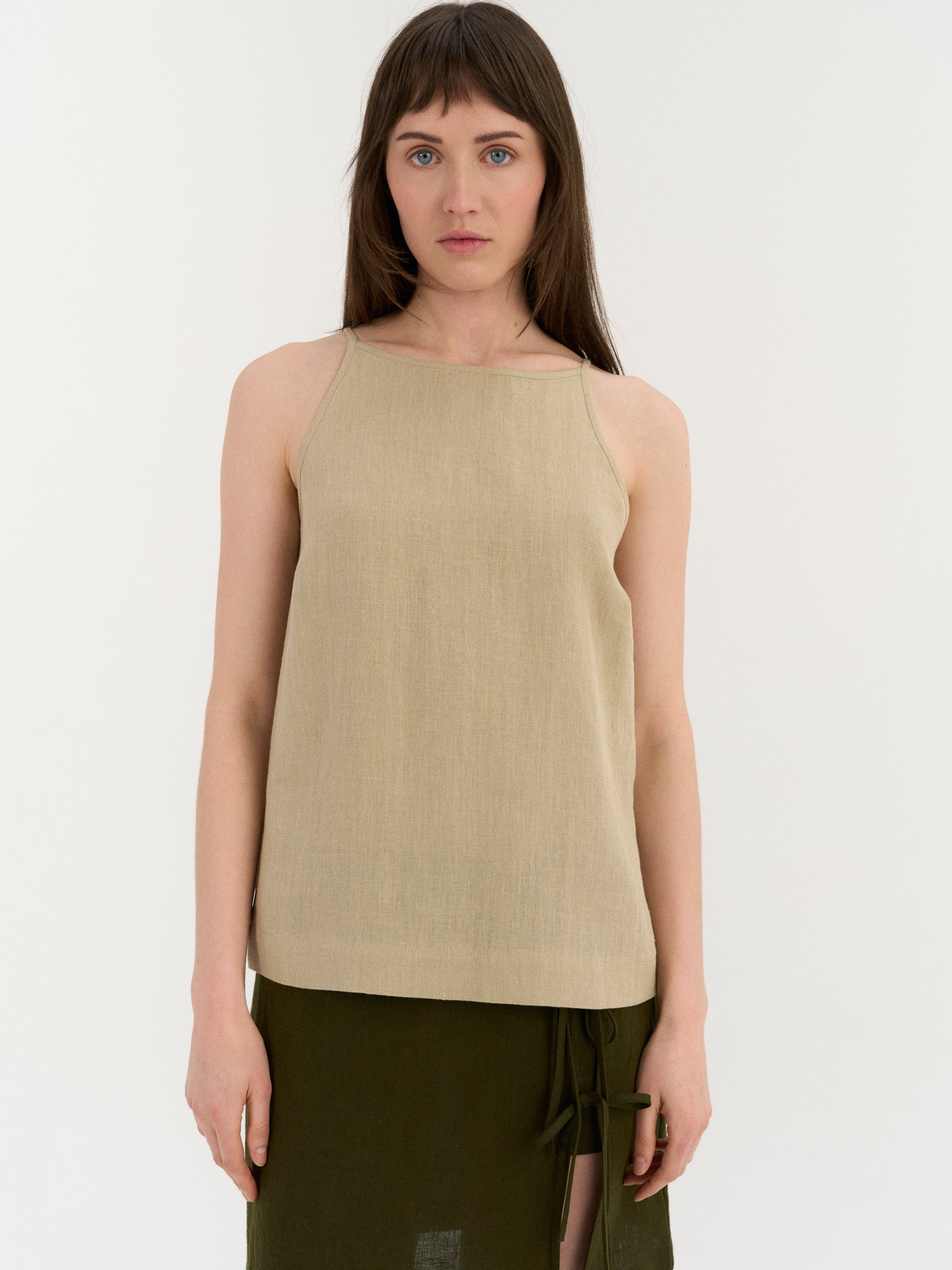 Sleeveless top with a clean, slightly A-line silhouette. The design features a high neckline with narrow shoulder straps and a smooth front. The back is finished with a small button closure and a subtle slit below the neckline. Cut to a relaxed fit with a gently curved hem.