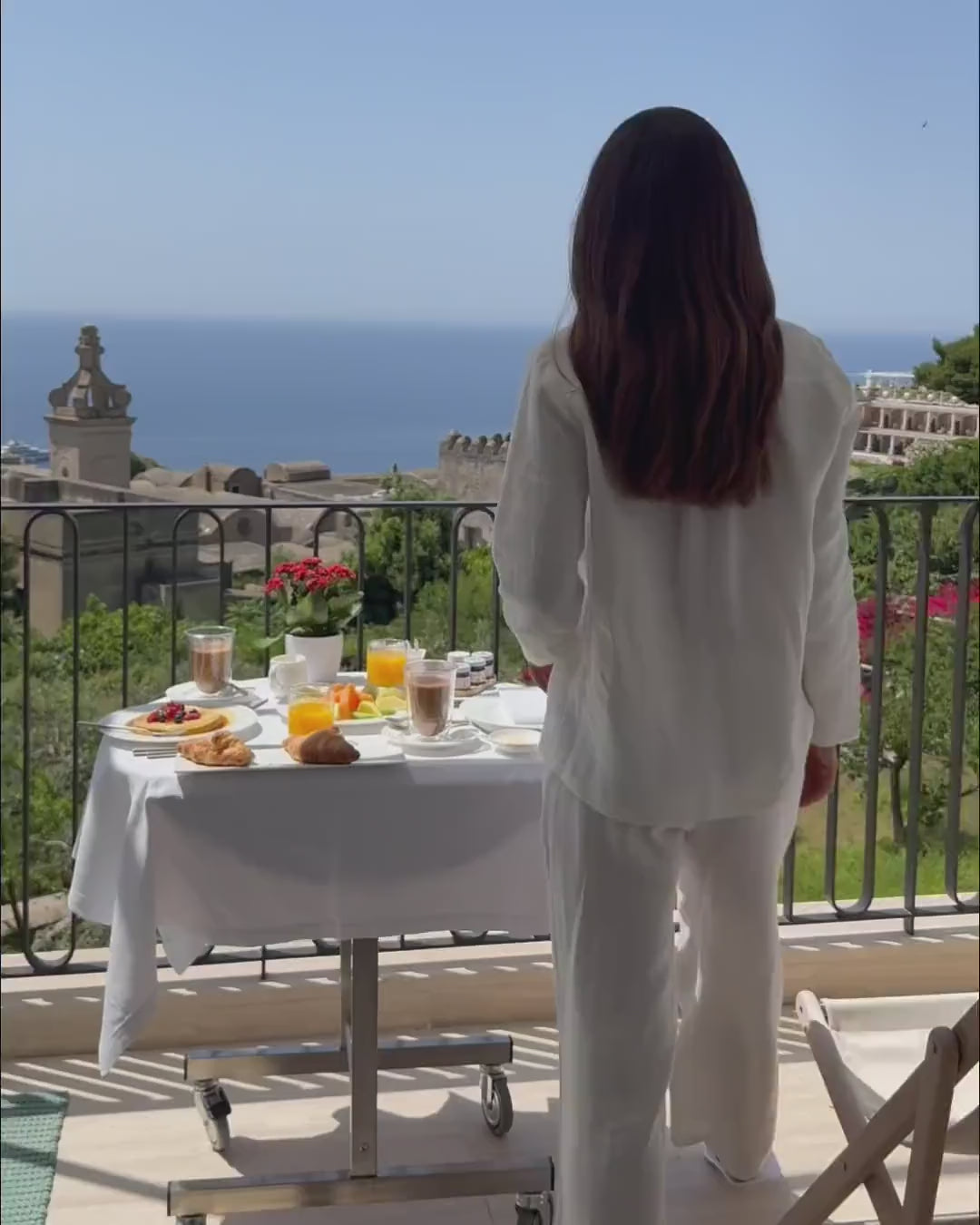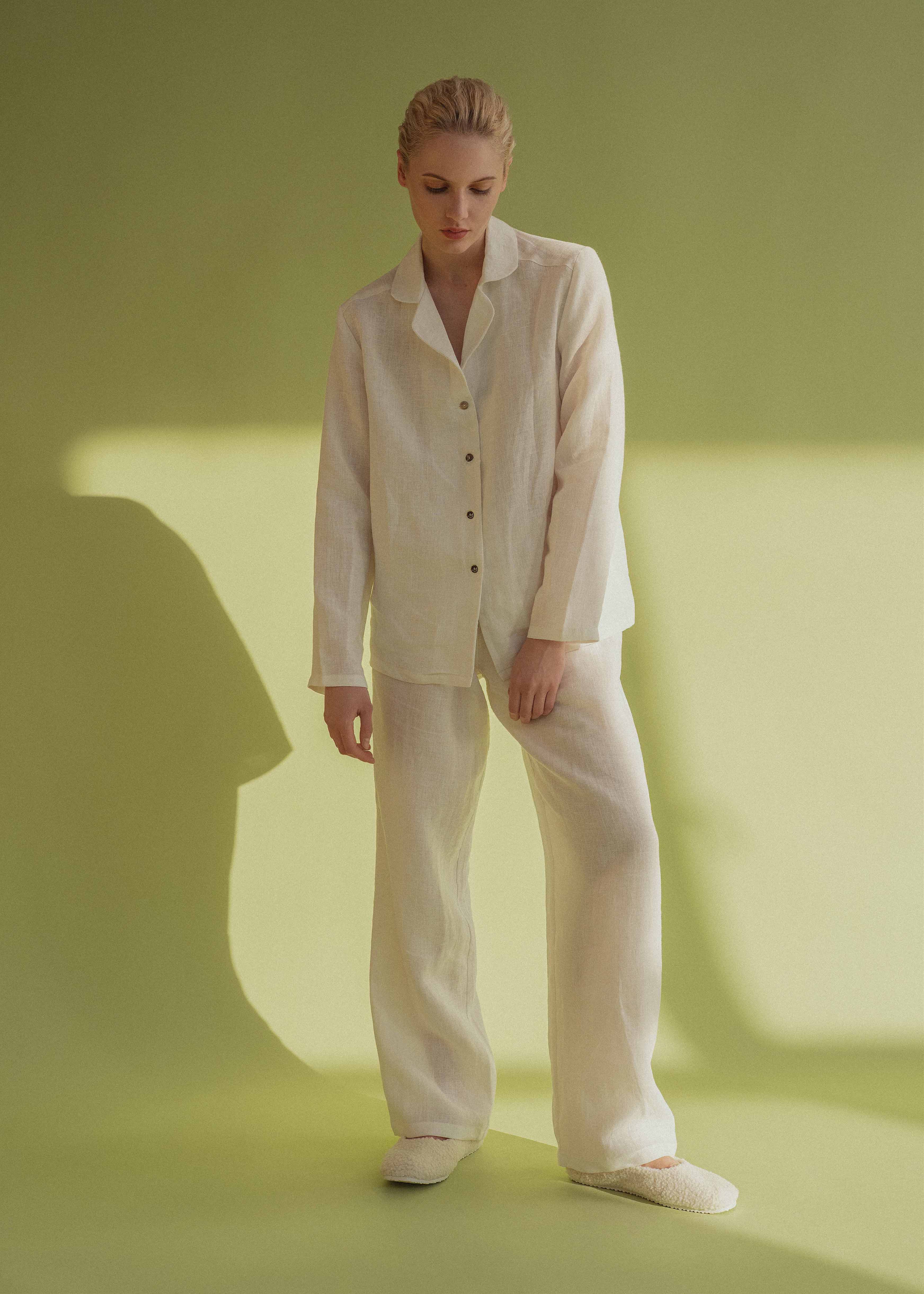 Zweiteiliges Leinen-Set mit entspannter, bequemer Passform. Das Oberteil ist mit durchgehender Knopfleiste und klassischem Kragen gestaltet und bietet einen schlichten, zeitlosen Look. Die passende Hose verfügt über einen elastischen Bund mit verstellbarem Tunnelzug und ein glattes, taschenloses Design für eine klare Silhouette – ideal für den Alltag oder zum gemütlichen Entspannen zu Hause.